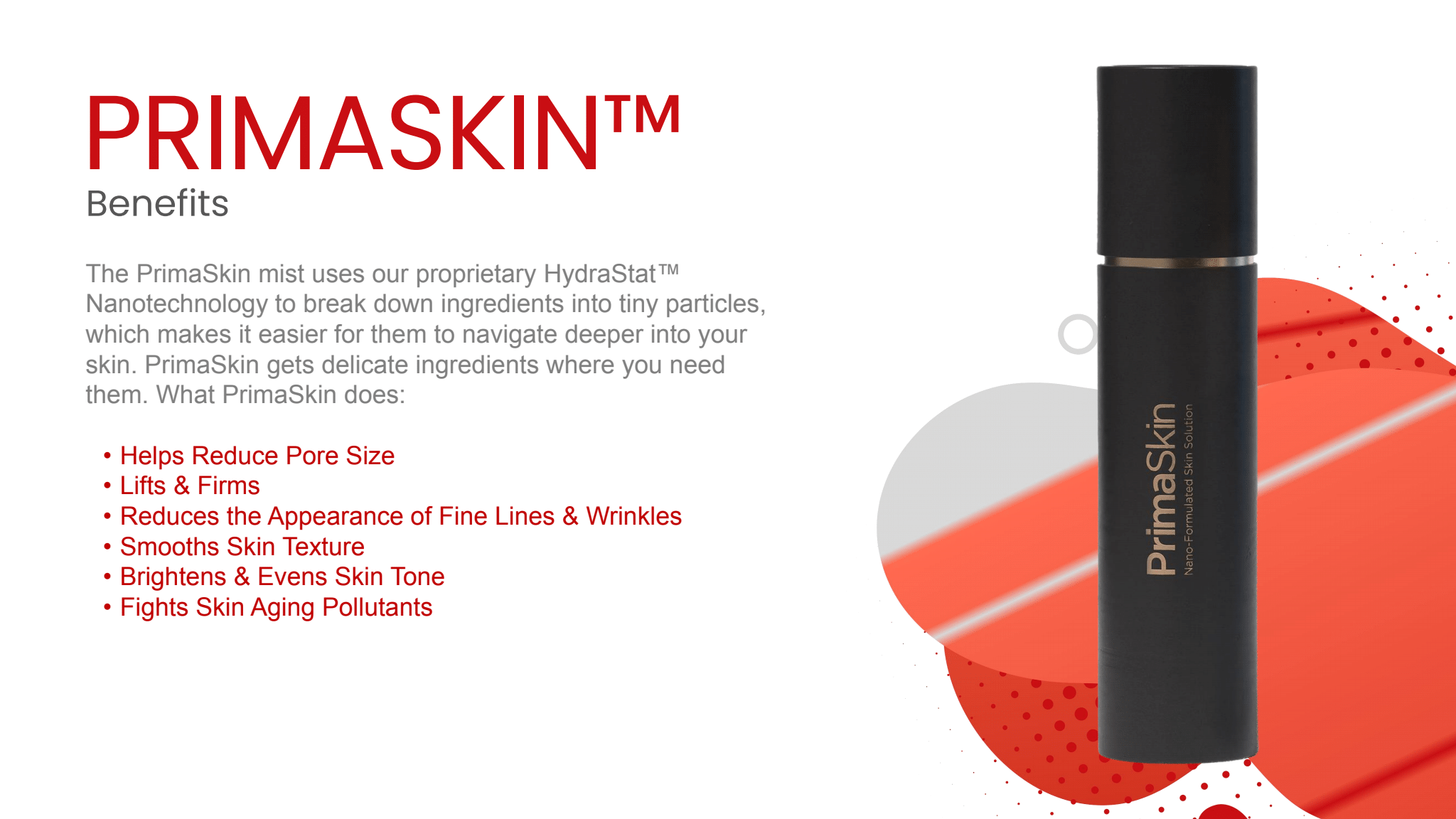 PrimaSkin uses proprietary HydraStat Nanotechnology™ to break down ingredients into tiny particles, making it easier for them to navigate deeper into your skin. We get delicate ingredients where you need them for incredible results faster.